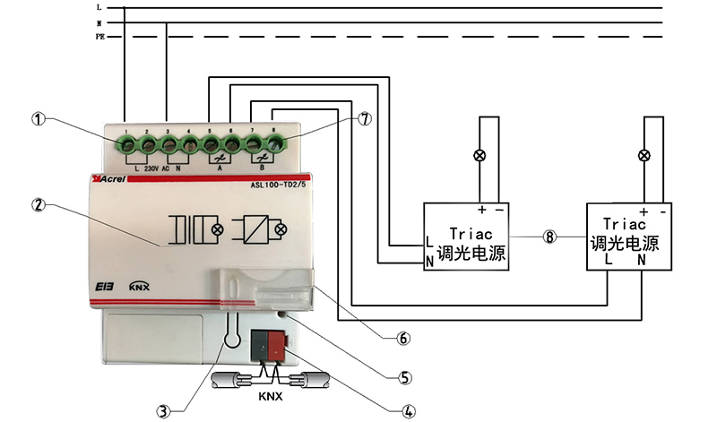 此端子和受控燈具的Triac調光電源接線,可實現調光功能