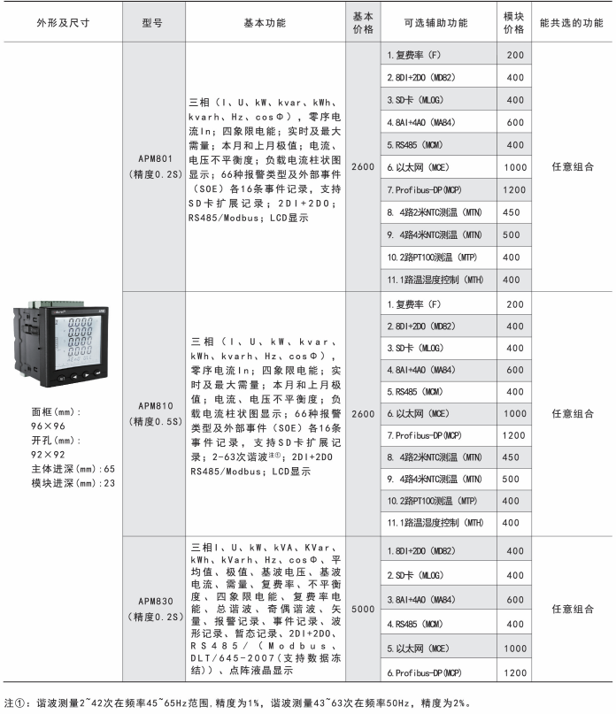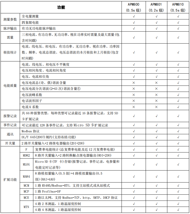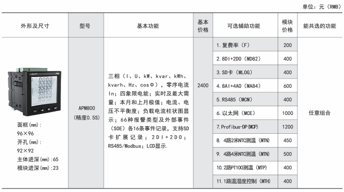 APM系列網(wǎng)絡電力儀表按IEC標準設計,具有全電量測量,電能統(tǒng)計,電能質量分析及網(wǎng)絡通訊等功能,主要用于對電網(wǎng)供電質量的綜合監(jiān)控診斷及電能管理。該系列儀表采用了模塊化設計,當客戶需要增加開關量輸入輸出,模擬量輸入輸出,SD卡記錄,以太網(wǎng)通訊時,只需在背部插入對應模塊即可。