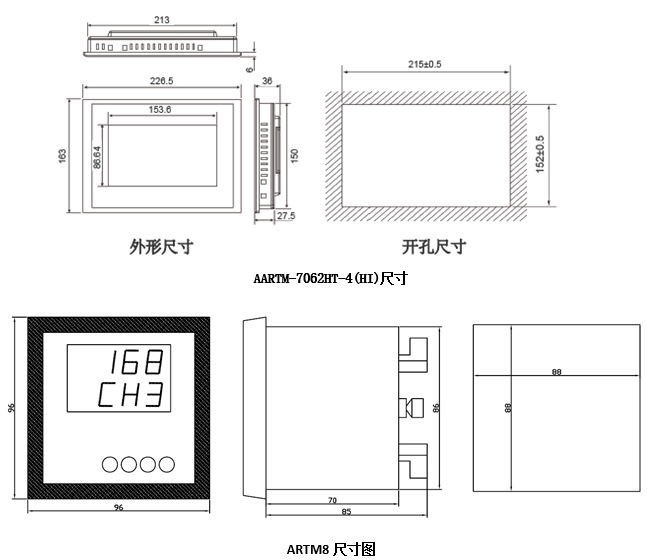 ARTM8溫度巡檢儀:ARTM系列溫度巡檢測控儀適用于一路或多路溫度的測量和控制,主要應用于火電廠、水電站等場合的溫度巡檢測量及控制。測量8通道Pt100溫度,也可以屏蔽其中任意通道。每一通道溫度測量對應2段報警,繼電器輸出可以任意設置報警方向及報警值。