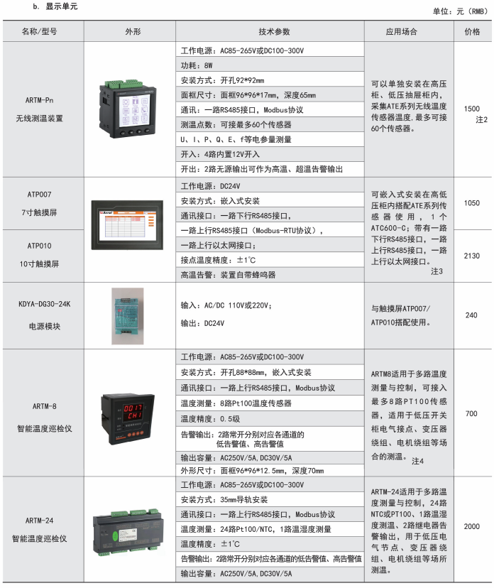 綜上所述,確定型號為:無線測溫集中觸摸屏:ARTM-7062HT-4(HI),1臺;無線測溫傳感器:ATE300,90個;無線測溫收發器:ATC400,1個;電源模塊:ARTM-KDYA-DG30-24K,1個。